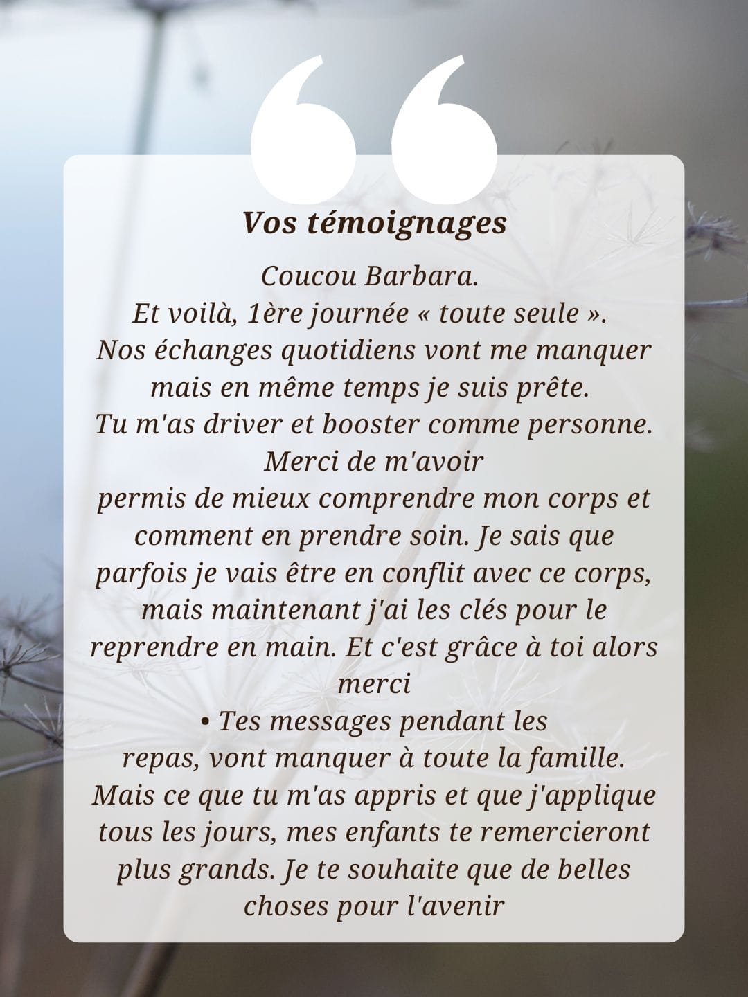 Un parcours en groupe, soutenant, motivant et bienveillant. Tu n’es plus seule : je te guide pas à pas, au sein d’une petite communauté de femmes qui te portent dans un véritable élan vers le mieux-être.