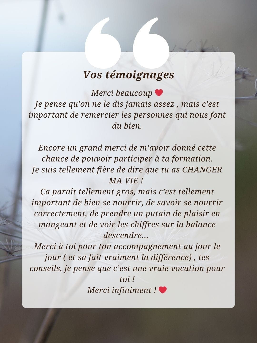 De ces prises de conscience est née une double passion : la nutrition et l’accompagnement. Ce parcours a révélé ma mission de cœur : guider à mon tour, celles et ceux qui veulent se libérer de leur poids, retrouver confiance et transformer leur rapport à l’alimentation avec douceur et bienveillance.